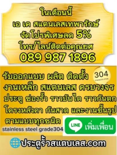 ประตูสแตนเลสล้วนบานเลื่อน ประตูสแตนเลสบานเลื่อนซ้อน ประตูสแตนเลสบานโค้ง ประตูสแตนเลสบานเฟี๊ยม(บานพับ) ช่องรั้วสแตนเลสลายไม้และสแตนเลสล้วน ราวกันตกสแตนเลส โครงหลังคาสแตนเลสและเหล็ก Oplus_0 กันสาดสแตนเลสและเหล็ก หุ้มเสาและหุ้มหน้าลิฟท์สแตนเลส Map-marked-alt Phone-alt Line Map-marked-alt Phone-alt Line